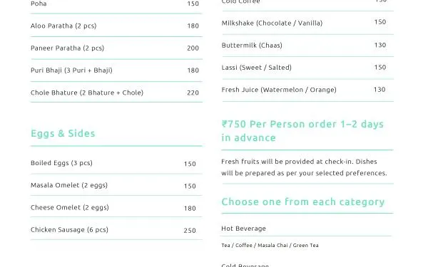 • Chef: Available on request (ingredients charged as per actuals).
